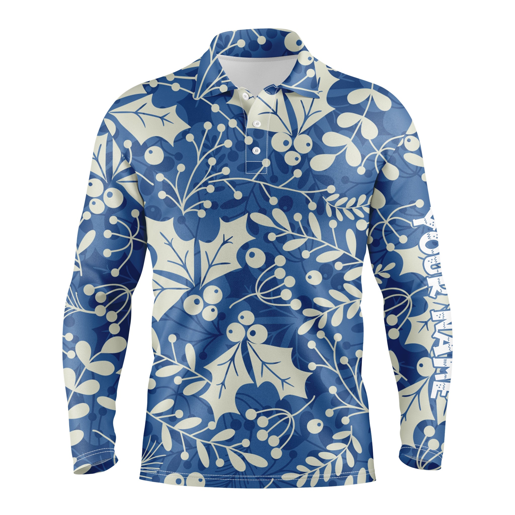 Mens golf polo shirts custom name Christmas holly leaves and berries pattern, Christmas golf gift NQS4448