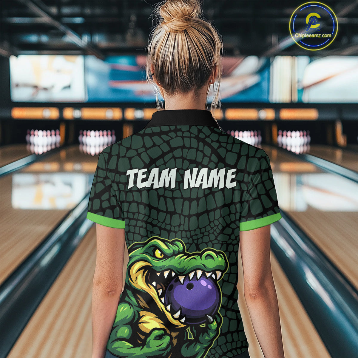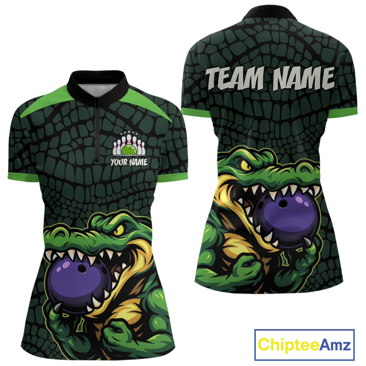 Green Alligator Bowling Polo, Quarter Zip shirts for Women Custom Team bowling uniform jersey NQS10734