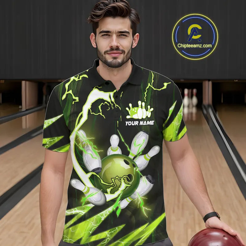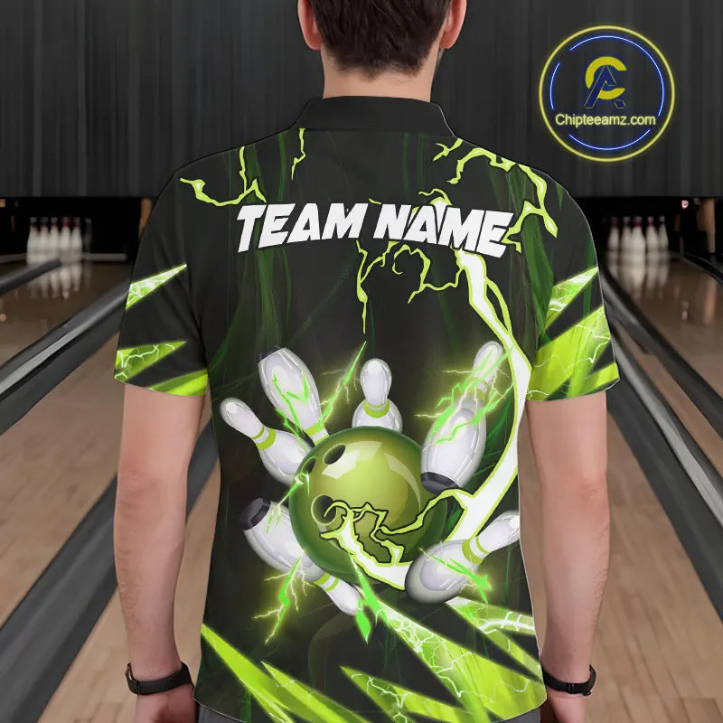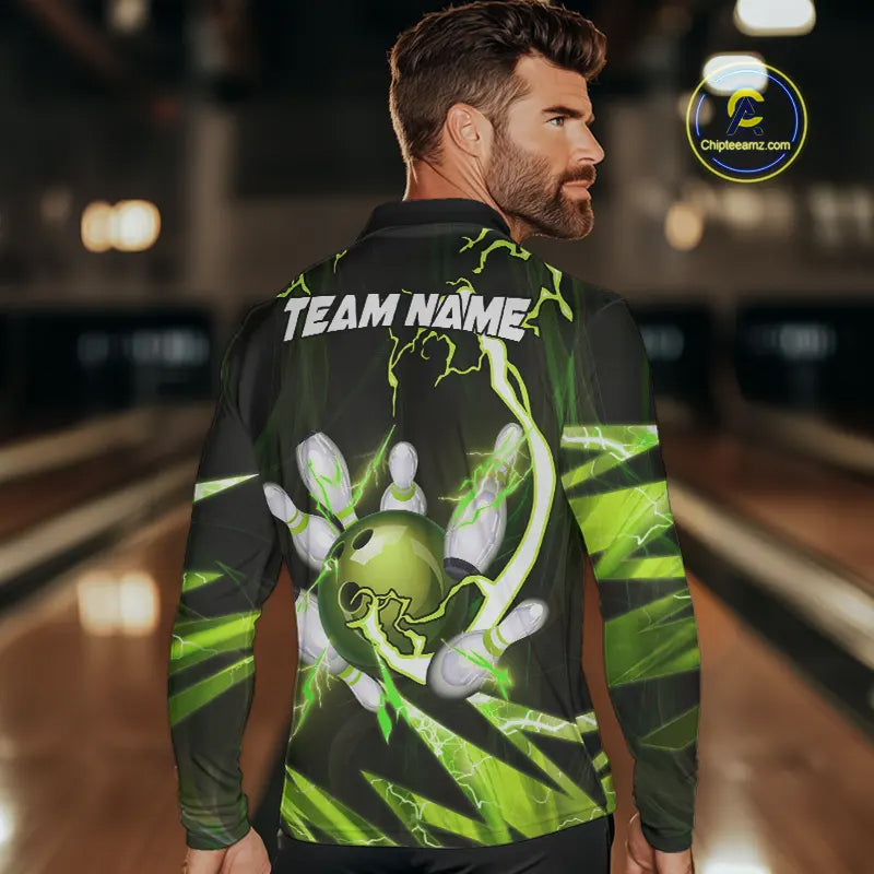 Green Thunder Lightning bowling ball and pins jerseys Custom Team Bowling Polo, 1/4 Zip Shirts For Men NQS9832