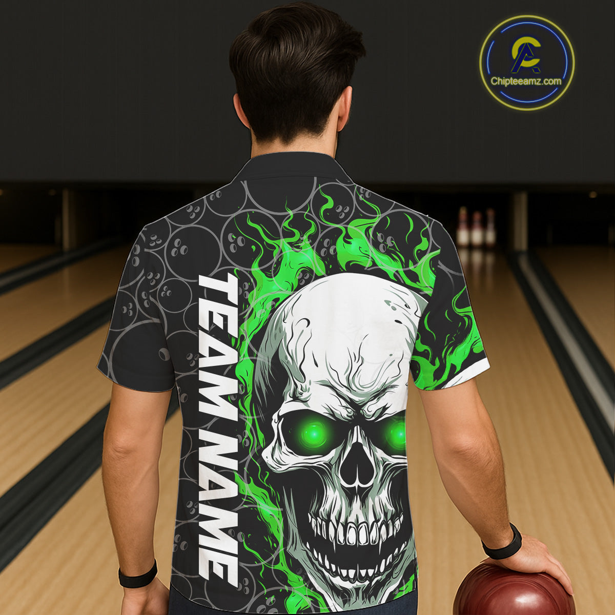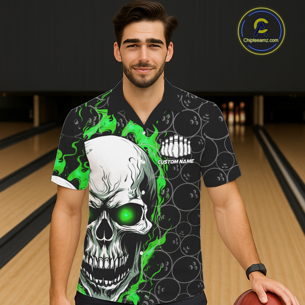 Custom Green Flame Skull Bowling Hawaiian Shirt For Men And Women, Halloween Bowler Jerseys IPHW5008