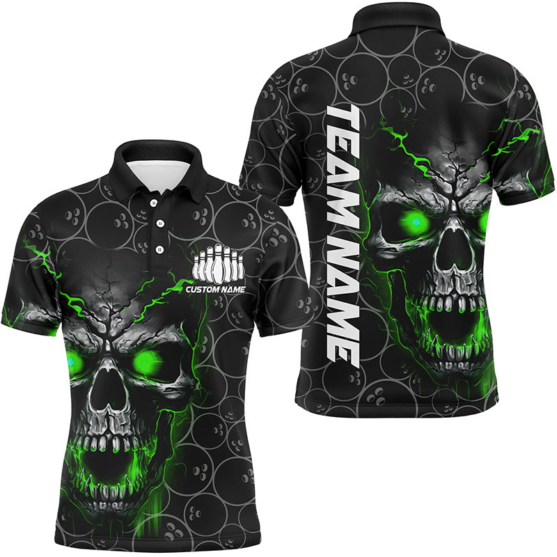 Custom Green Skull Bowling Polo Shirts For Men, Bowling Pattern Bowling Team Jerseys IPHW5236