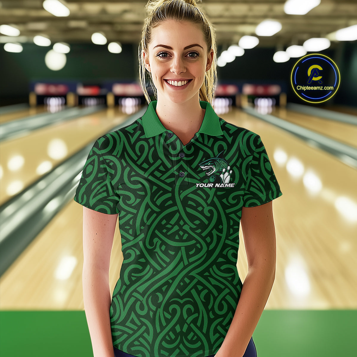 Custom Green Tribal Shark Bowling Team Women Polo Shirt, Shark Bowling Tournament Shirt IPHW10176