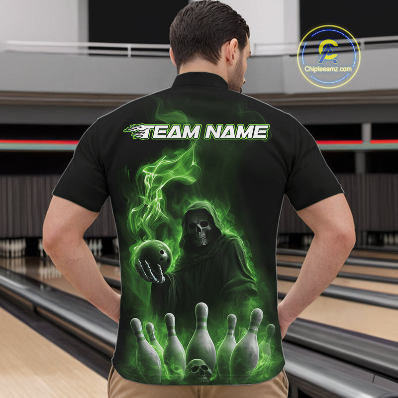 Custom Green Flame Grim Reaper Bowling Men Quarter-Zip Shirts, Halloween Bowler Outfit IPHW9738