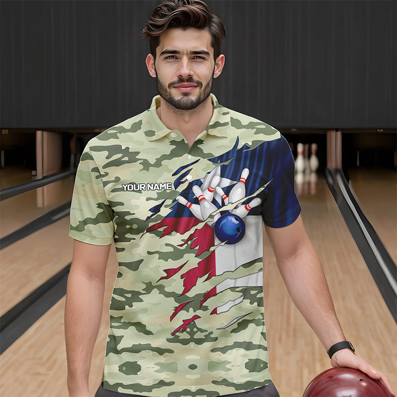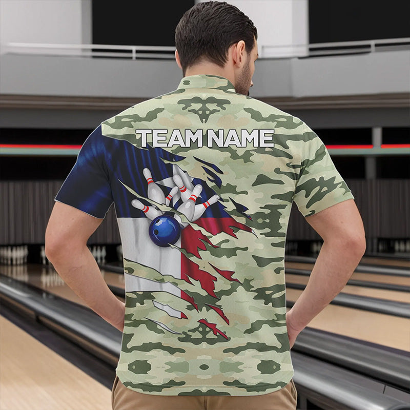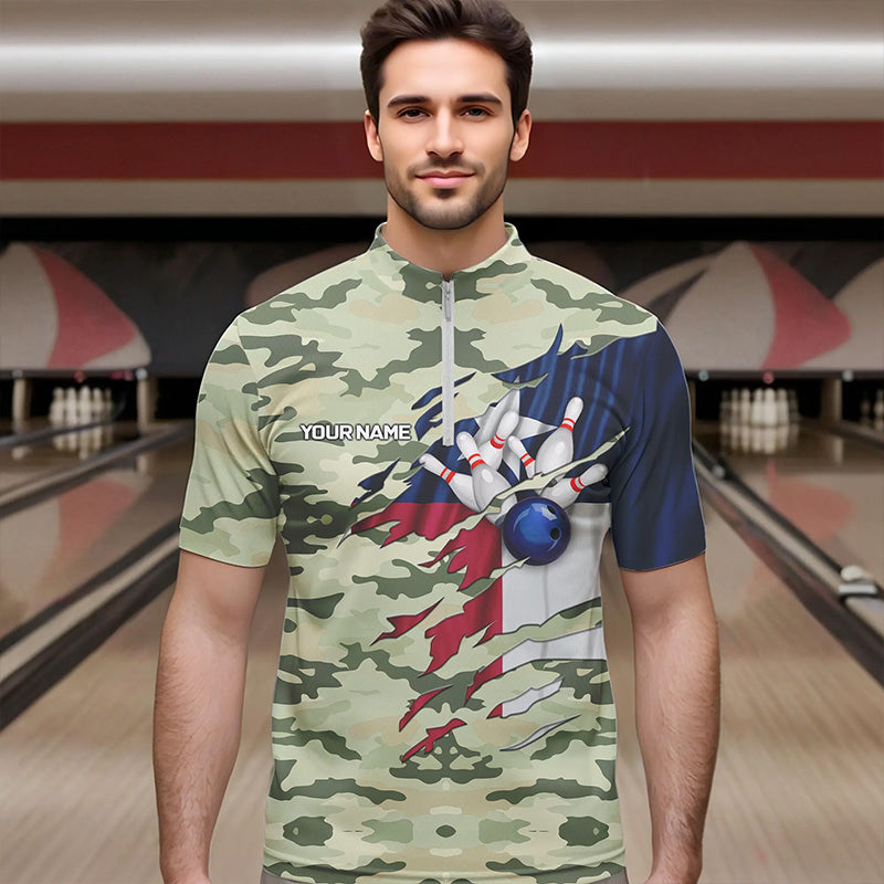 Texas Flag Green Camo Bowling Polo, Quarter Zip shirts for Men custom Texas Bowling Team Jerseys NQS9536
