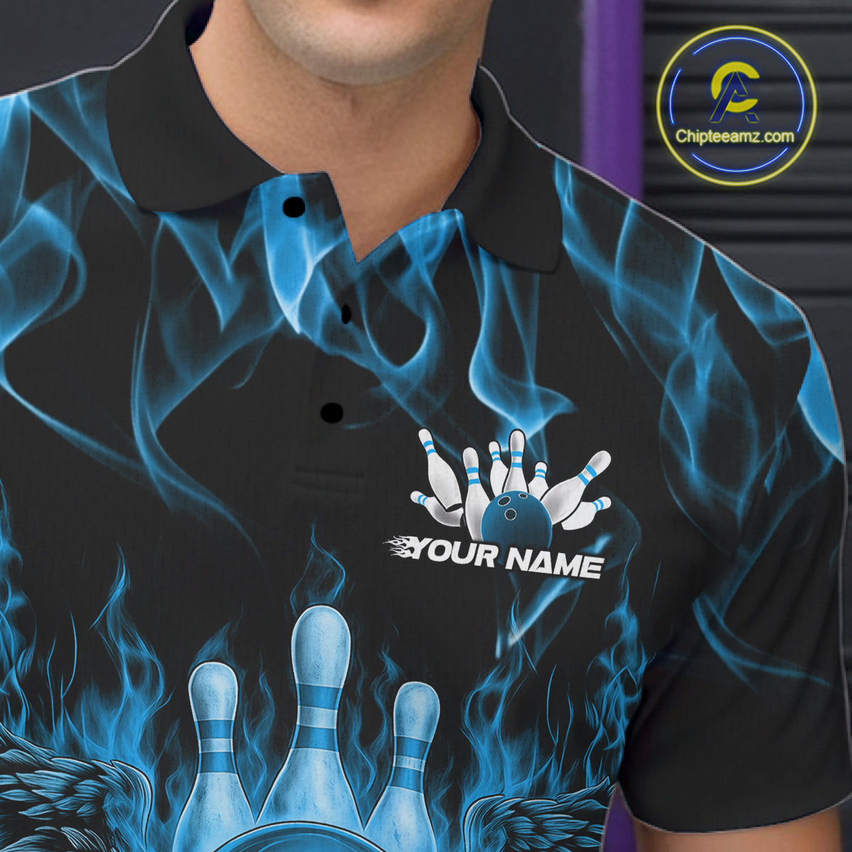 Custom Black And Blue Flame Skull With Wings Men Bowling Shirt, Halloween Team Shirt IPHW10166
