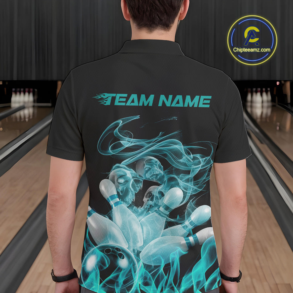 Custom Turquoise Blue Skull Smoke Bowling Team Men Polo Shirts, Halloween Bowling Outfit IPHW9774
