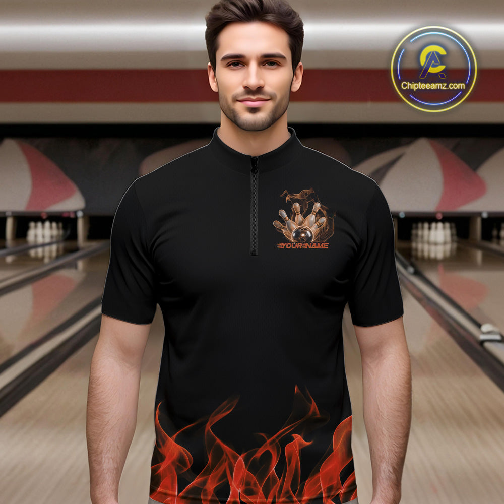 Custom Orange Skull Smoke Bowling Team Men Quarter-Zip Shirts, Halloween Bowling Outfit IPHW9775