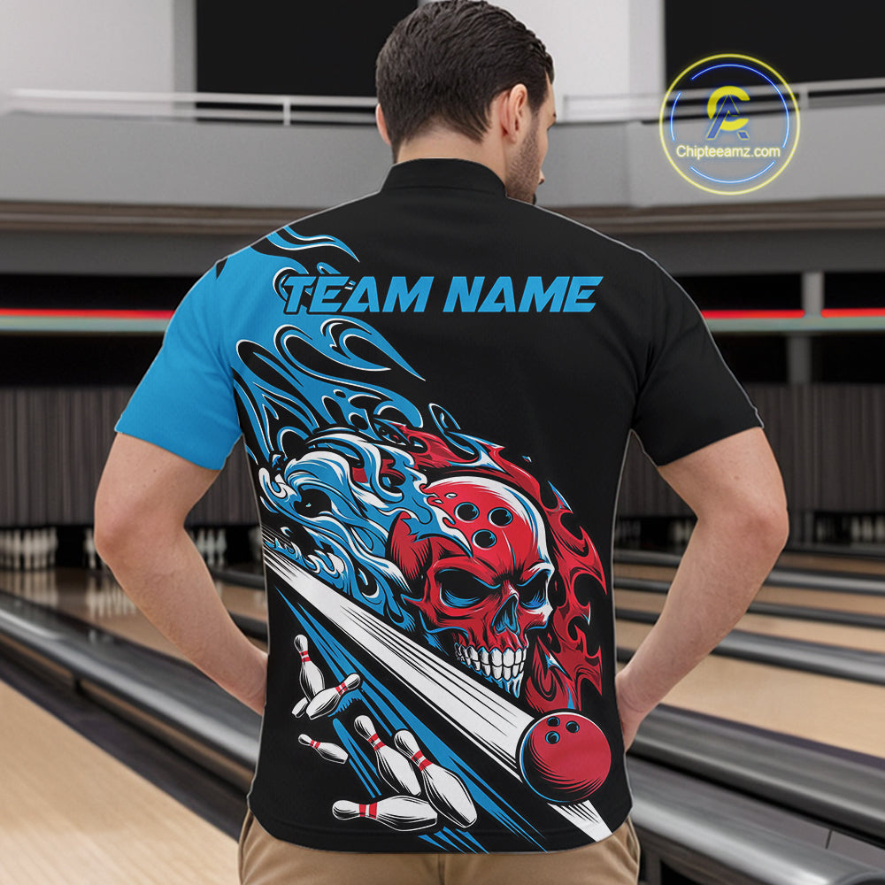 Custom Blue And Red Flame Skull Bowling Quarter-Zip Shirt For Men, Halloween Bowling Jersey IPHW9888