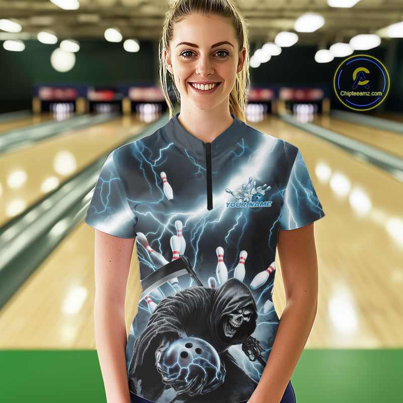 Custom Blue Lightning Grim Reaper Bowling Women Quarter-Zip Shirt, Halloween Outfit IPHW9797