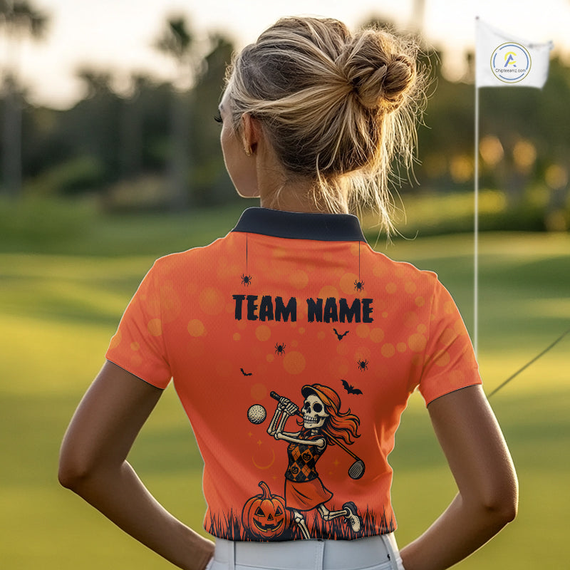Custom Funny orange Golf skull Halloween Women golf polo shirt, Personalized Halloween golf outfit NQS10397