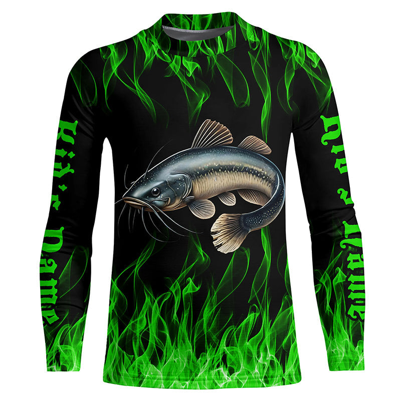 Catfish Fishing Custom Long Sleeve Fishing Shirts, Green Flame Catfish Fishing Tournament Shirt IPHW7018