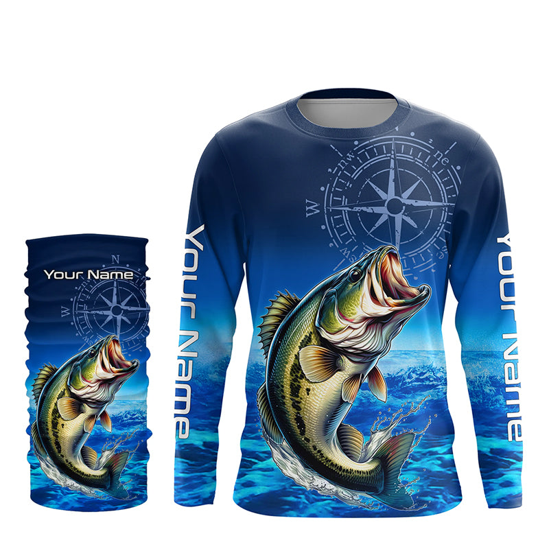 Personalized Bass Blue Long Sleeve Performance Fishing Shirts, Bass compass tournament Shirts NQS5817
