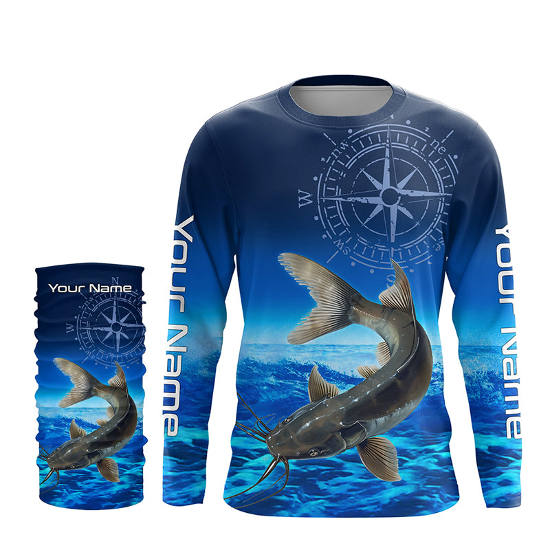 Personalized Catfish Blue Long Sleeve Performance Fishing Shirts, compass Catfish tournament Shirt NQS5984