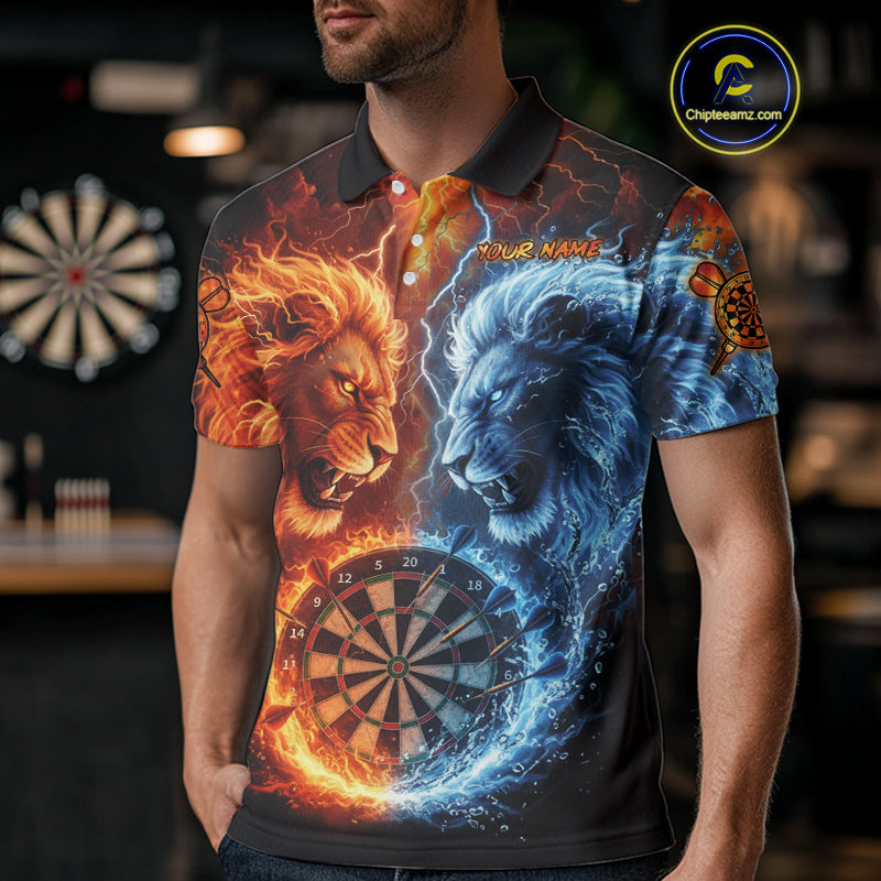Blue And Orange Water Fire Lion Darts Shirt For Men Custom Lightning Dart Jerseys Polo & 1/4 Zip TDM5249