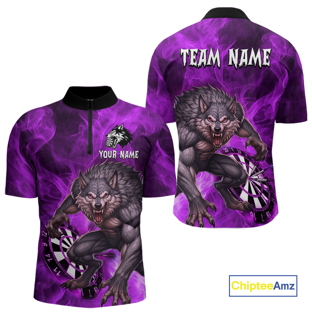 Purple Flaming Wolf Darts Shirt For Men Custom Darts League Jersey Team Polo & Quarter Zip TDM5358