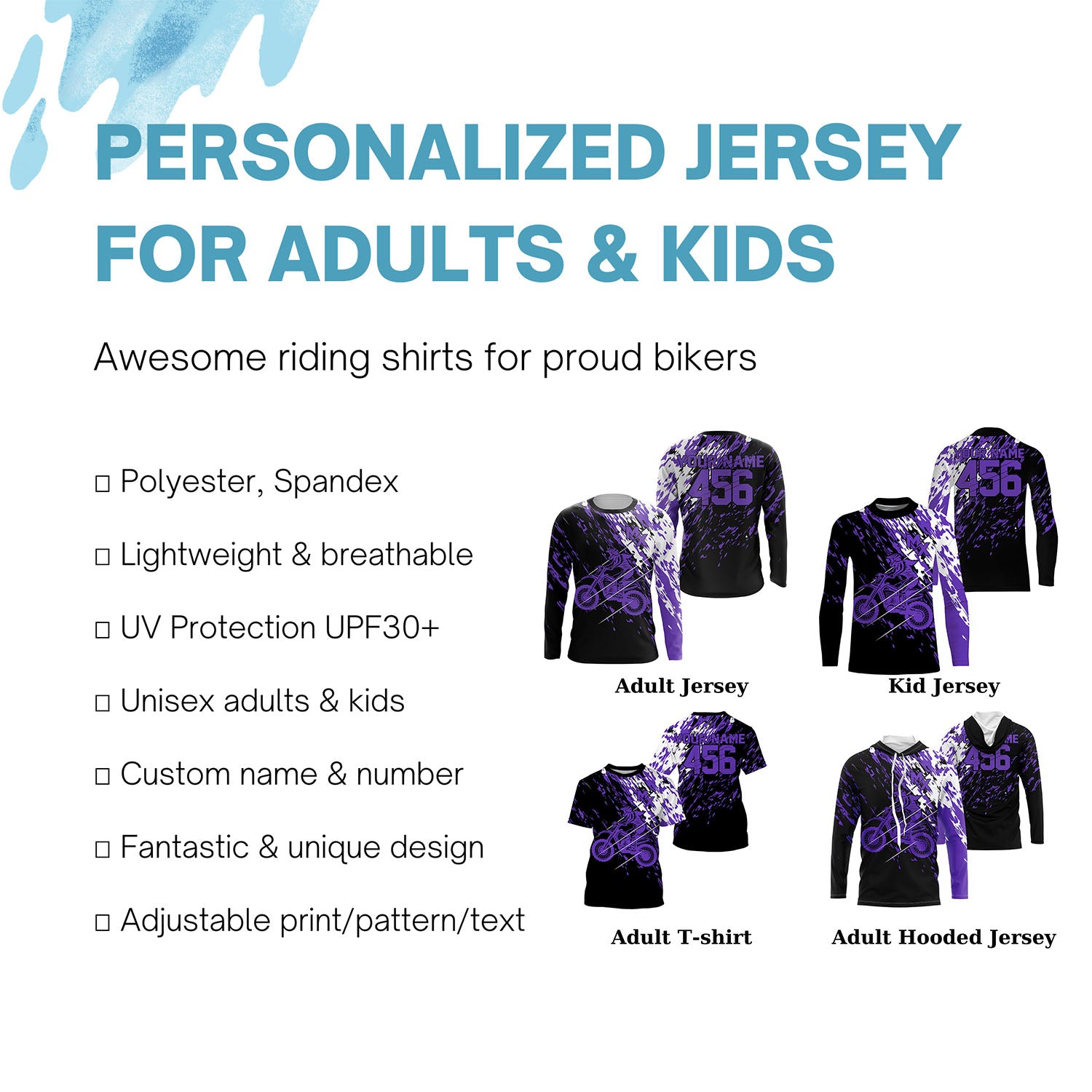 - PERSONALIZED MOTOCROSS JERSEY: This super cool long-sleeved shirt is exactly what all bikers are looking for. Add your name/number to make it a unique one that bears your own imprints.