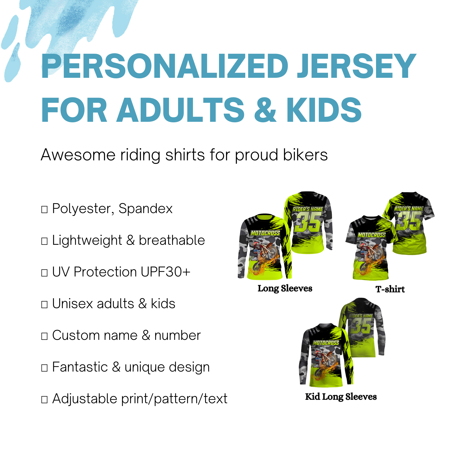 - PERSONALIZED RIDING JERSEY: This super cool shirt is exactly what all bikers are looking for. Add your name/number to make it a unique one that bears your own imprints.