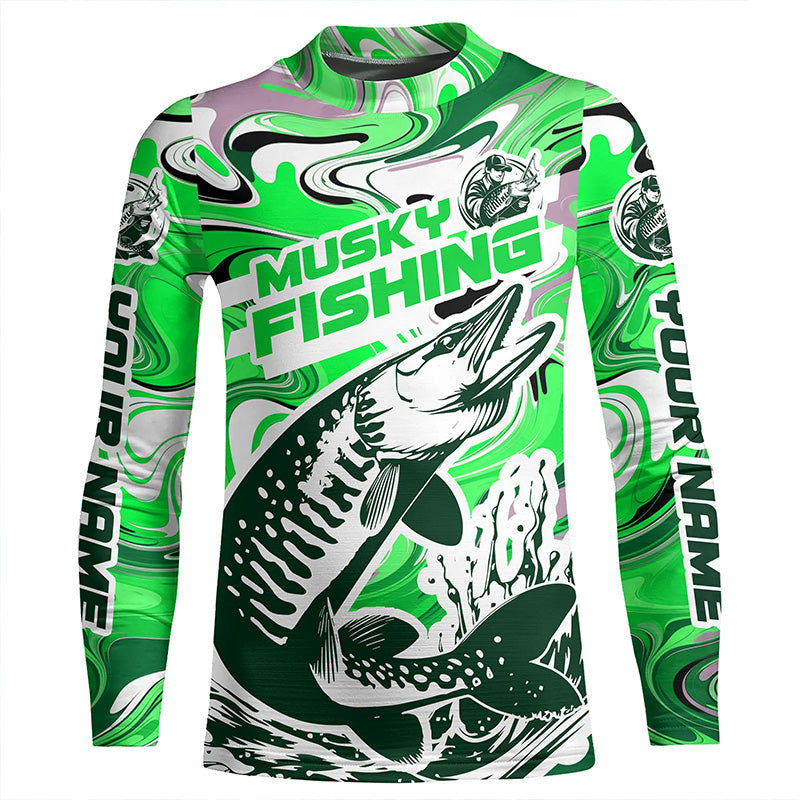 Custom Musky Long Sleeve Tournament Fishing Shirts, Water Camo Muskie Fishing Jerseys | Green IPHW6162