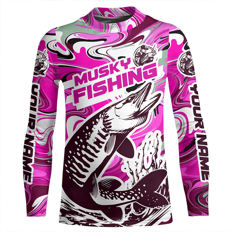 Custom Musky Long Sleeve Tournament Fishing Shirts, Water Camo Muskie Fishing Jerseys | Pink IPHW6163