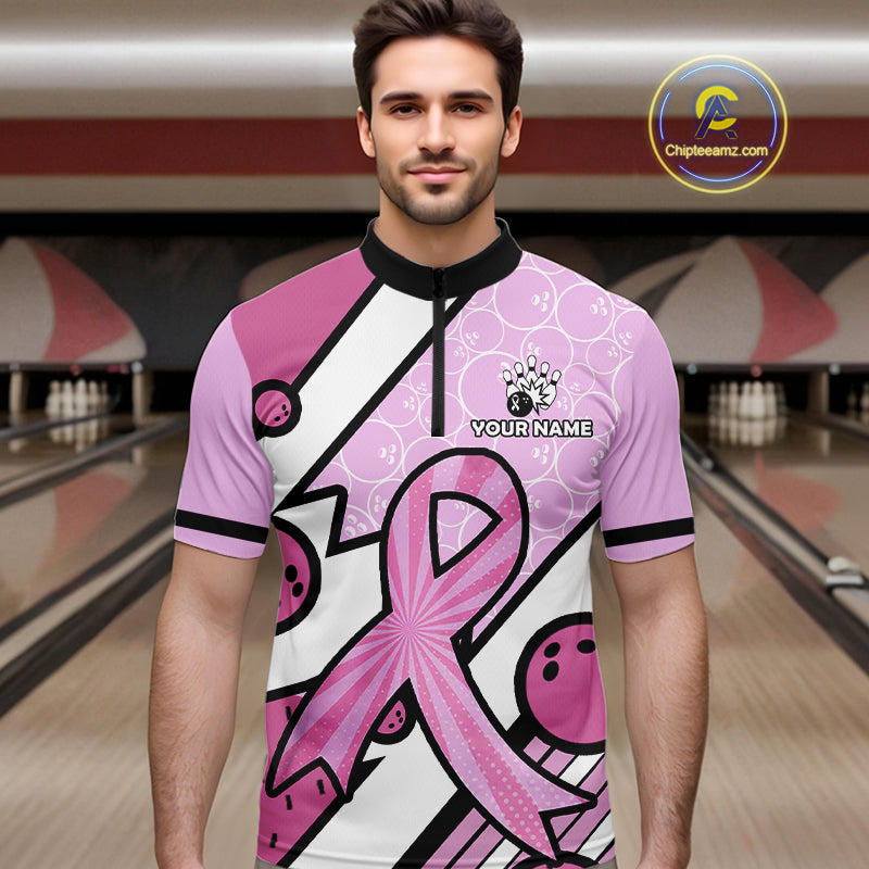 Personalized Pink Ribbons Camo Bowling Shirts For Men, Custom breast cancer bowling Team shirts NQS10533