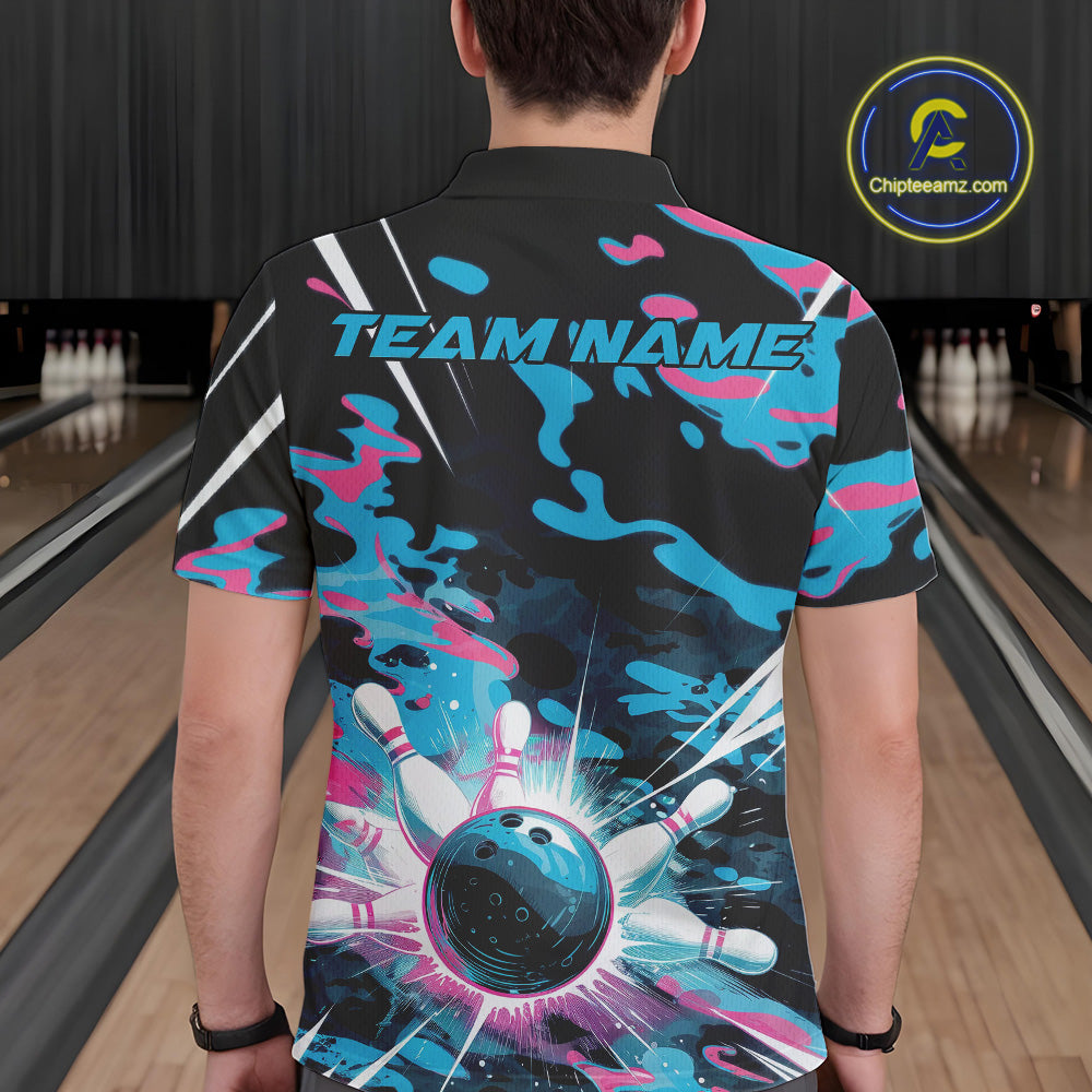 Custom Blue And Pink Camo Bowling Polo Shirts For Men, Camouflage Bowling Team Outfit IPHW9832