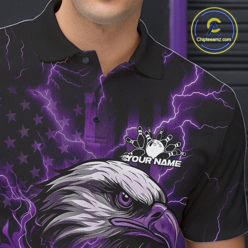 Custom Purple Lightning Flame Eagle Men Bowling Shirt, Patriotic US Team Shirt IPHW10175