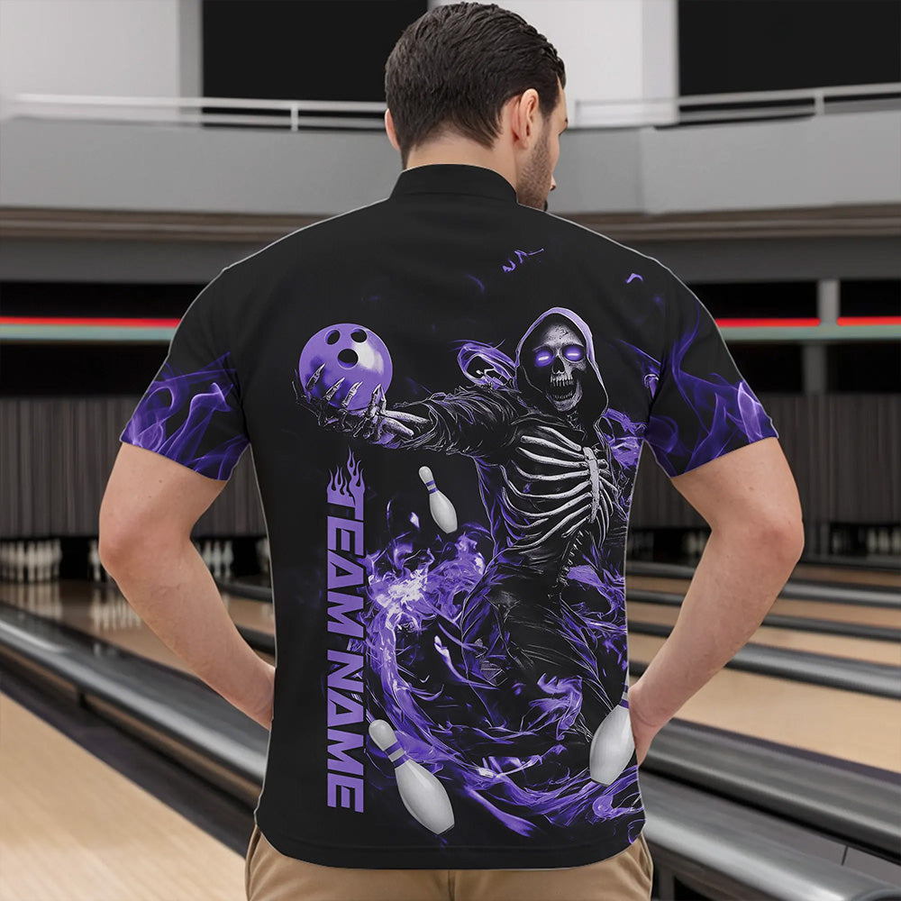 Custom Black And Purple Skeleton Bowling Quarter-Zip Shirts For Men, Skull Bowling Tournament Shirt IPHW8412