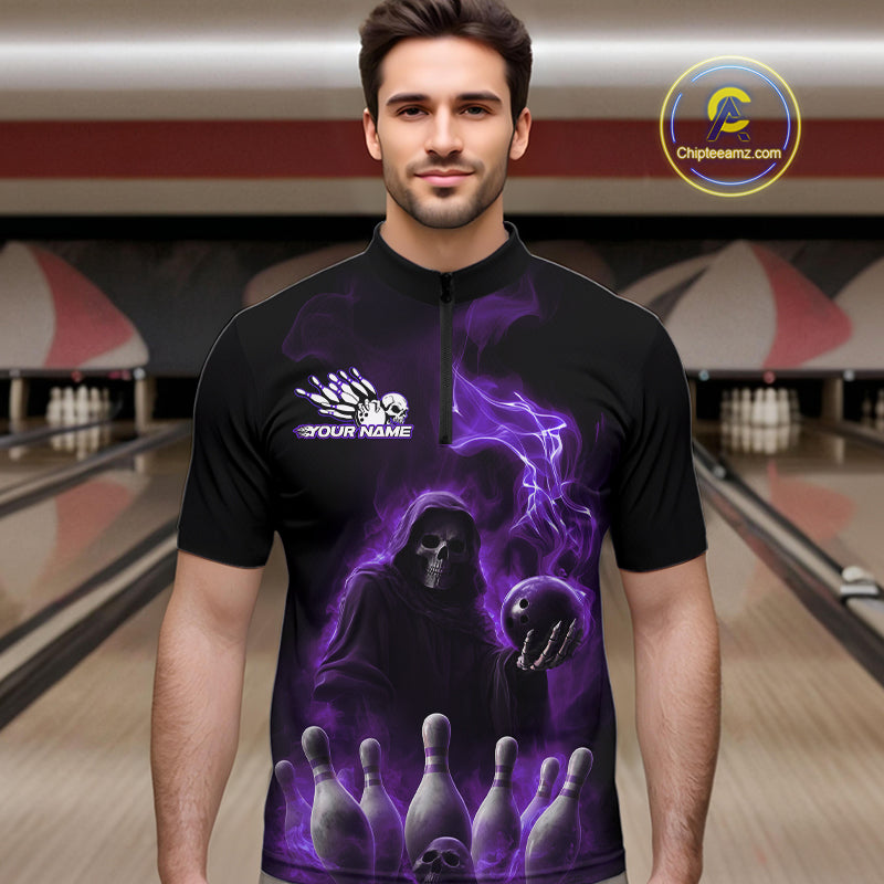 Custom Purple Flame Grim Reaper Bowling Men Quarter-Zip Shirts, Halloween Bowler Outfit IPHW9737