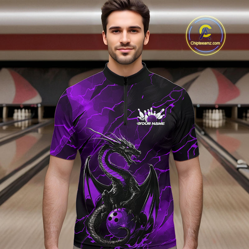 Custom Purple Lightning Dragon Bowling Quarter-Zip Shirt For Men, Dragon Bowling Team Jersey IPHW9902
