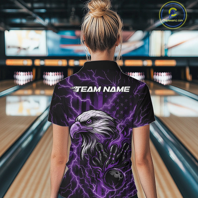 Custom Purple Lightning Flame Eagle Women Bowling Shirt, Patriotic US Team Shirt IPHW10175