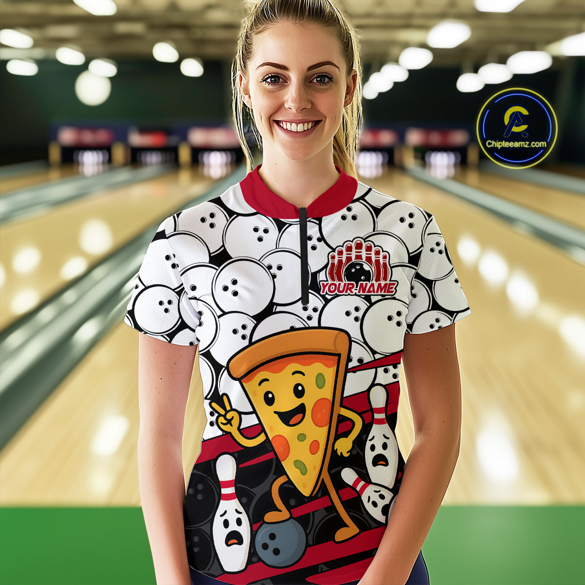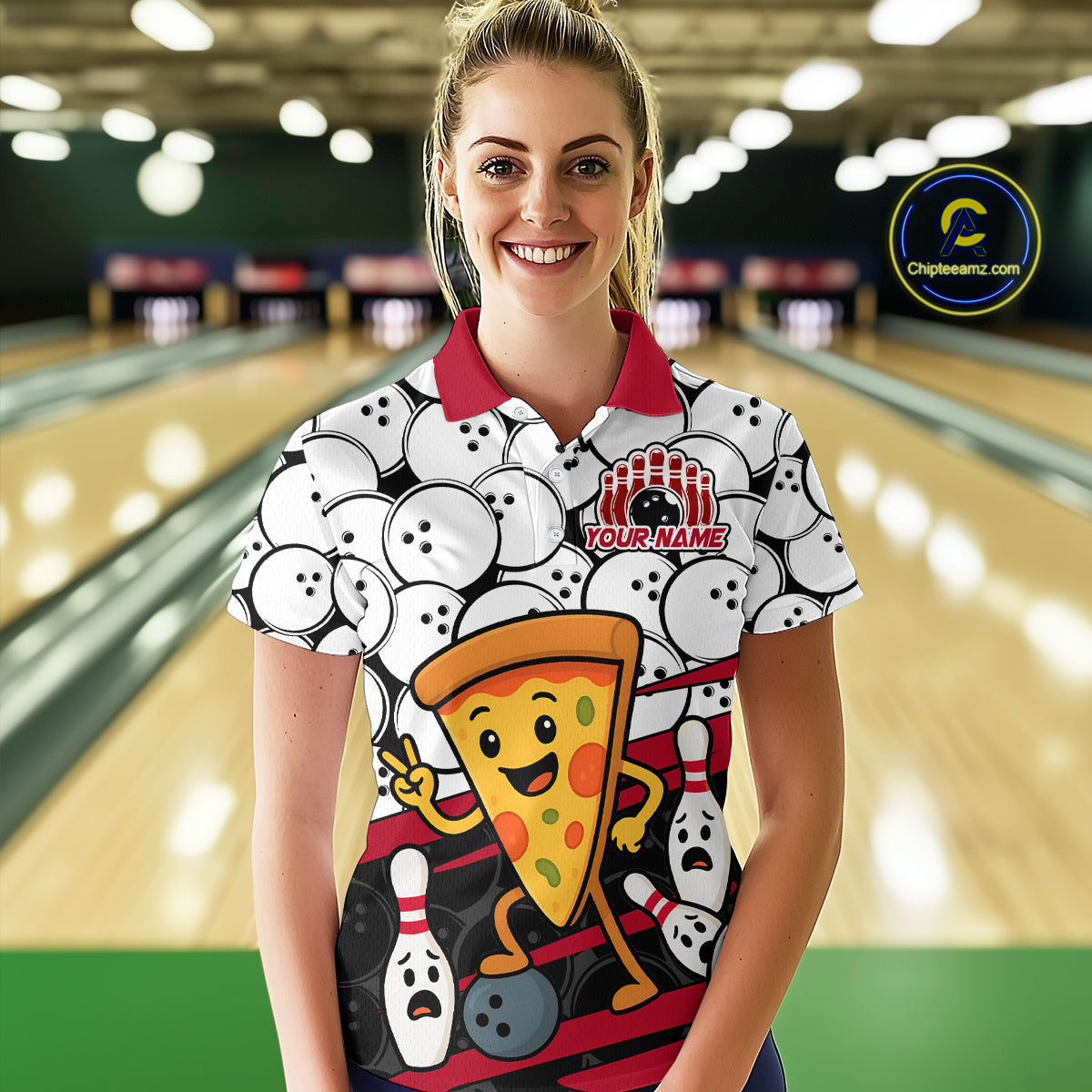 Custom Red Funny Pizza Bowling Shirt Bowling with Food for Women Polo Bowling Jersey QZT799