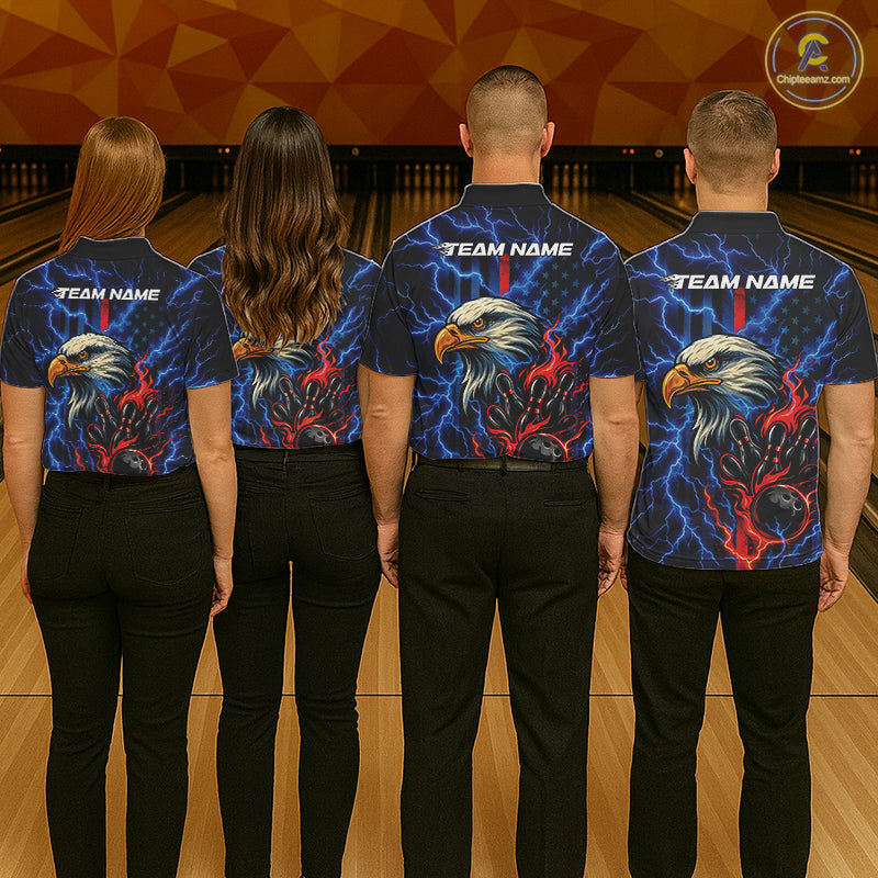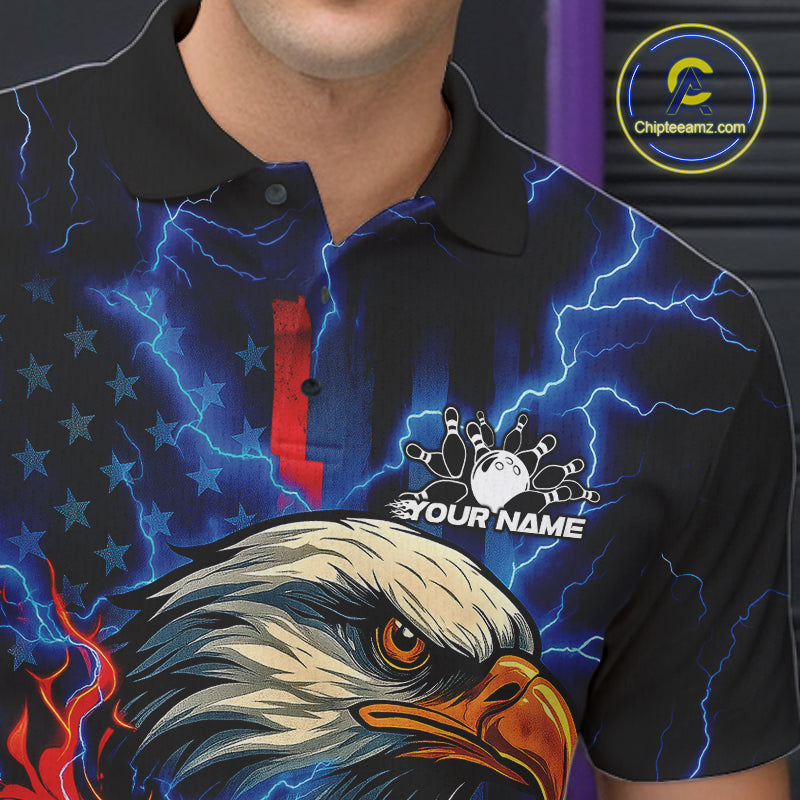 Custom Red And Blue Lightning Flame Eagle Men Bowling Shirt, Patriotic US Team Shirt IPHW10171