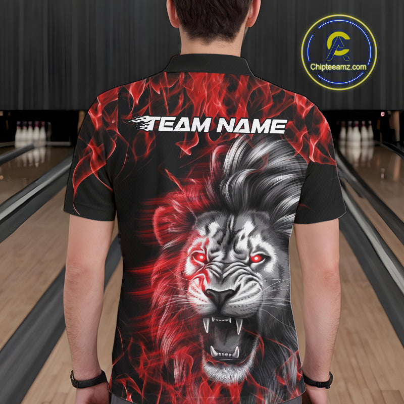 Custom Red Flame Lion Bowling Polo Team Shirts For Men, Lion Bowling League Shirt IPHW9326
