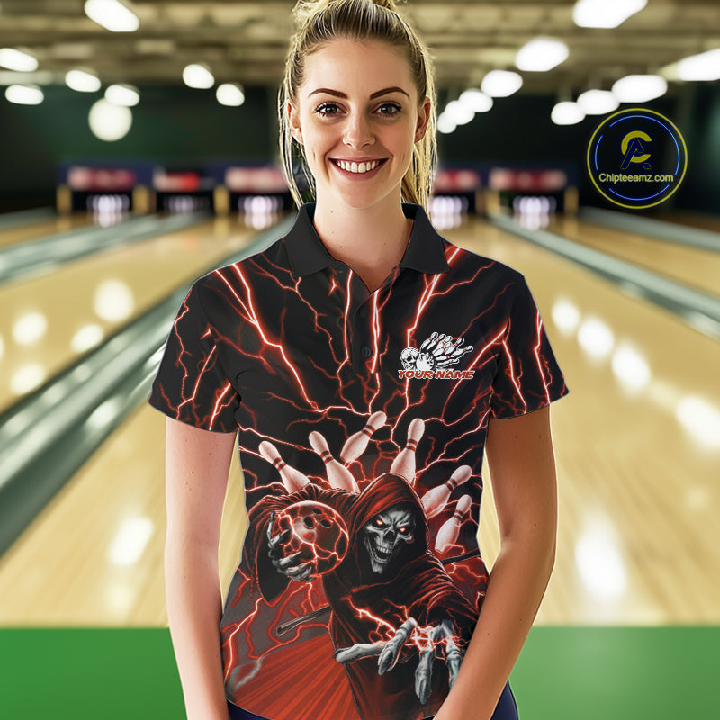 Custom Black And Red Lightning Grim Reaper Bowling Women Polo Shirt, Halloween Outfit IPHW9806