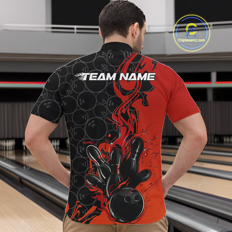 Custom Red Orange Fire Flame Bowling Team Men Quarter-Zip Shirts, Bowling League Shirt IPHW10184