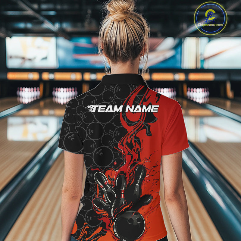 Custom Red Orange Fire Flame Bowling Team Women Quarter-Zip Shirts, Bowling League Shirt IPHW10184