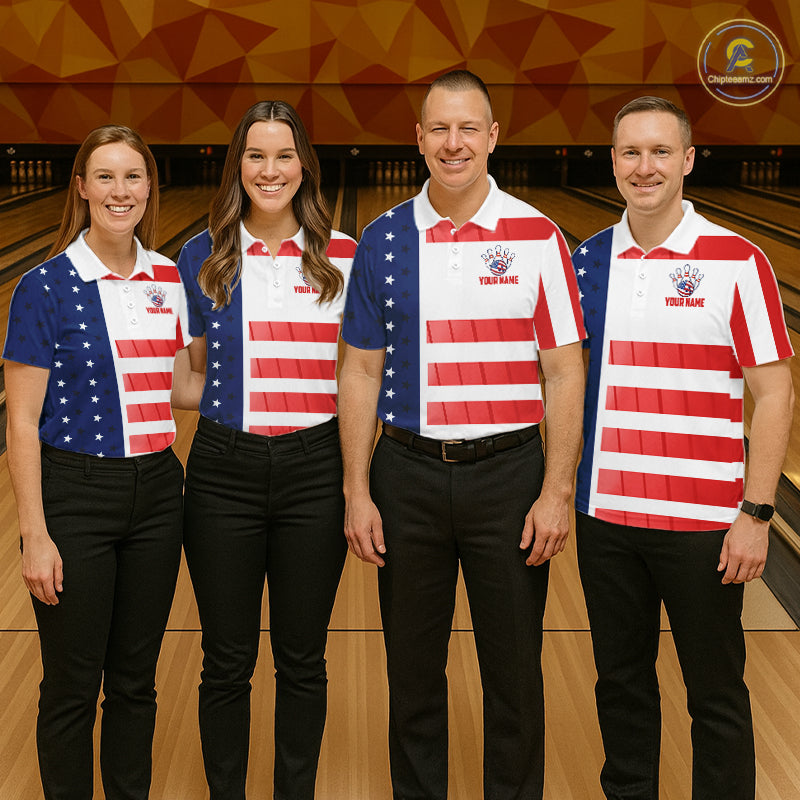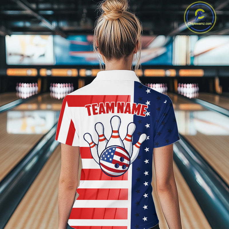 Red, White and Blue American Flag Bowling Shirts For Women Custom Patriotic Bowling Team Jerseys NQS11157
