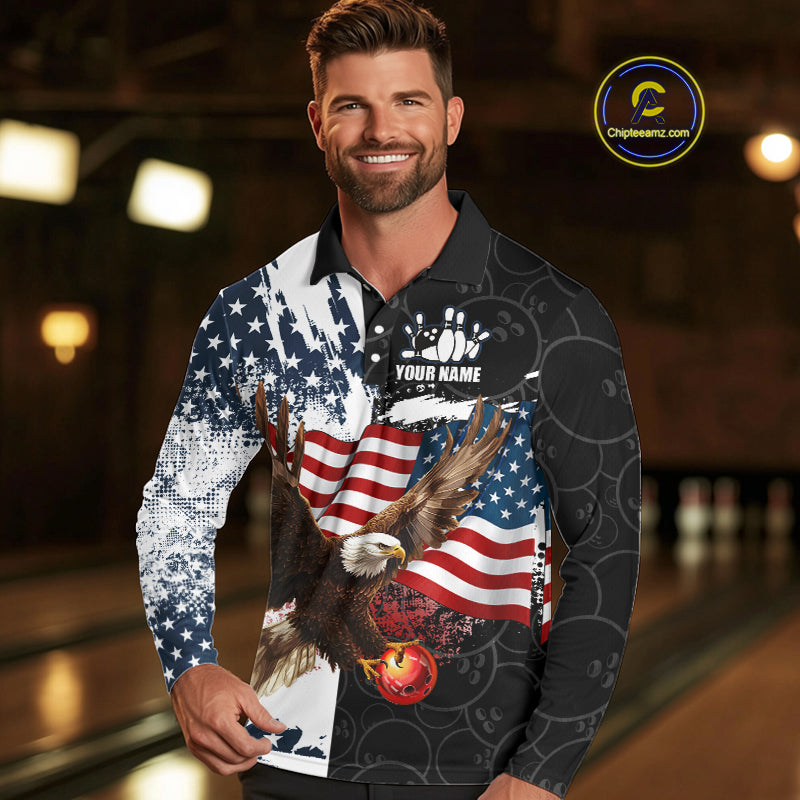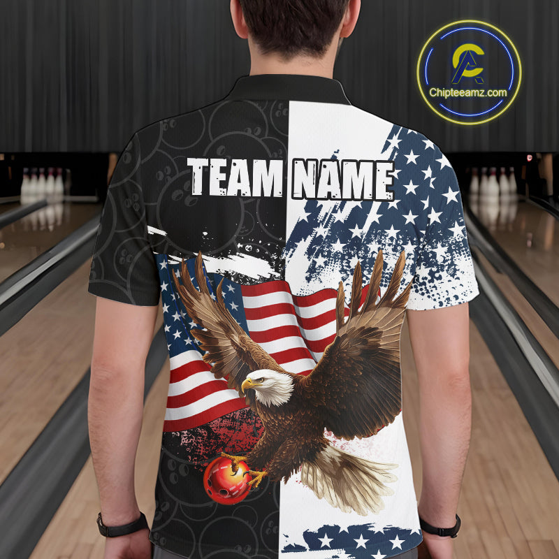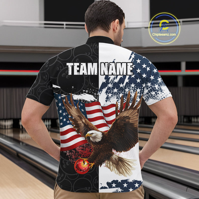 Red, White, Blue American Flag Eagle Men Bowling Shirt Custom Patriotic Black Camo Bowling Team Jersey NQS9863