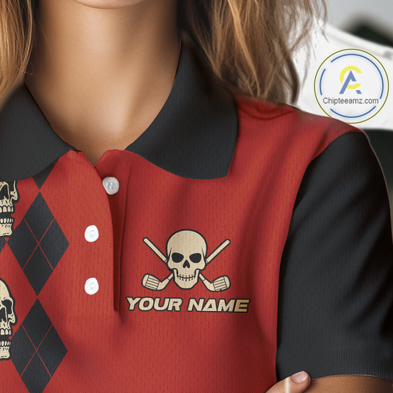 Red and Black argyle pattern Skull Golf Polo Shirts for Women Custom funny ladies golf outfit NQS10250