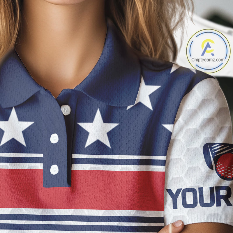 Red, White and Blue American Flag Womens golf polo shirts custom patriotic golf attire for ladies NQS10006