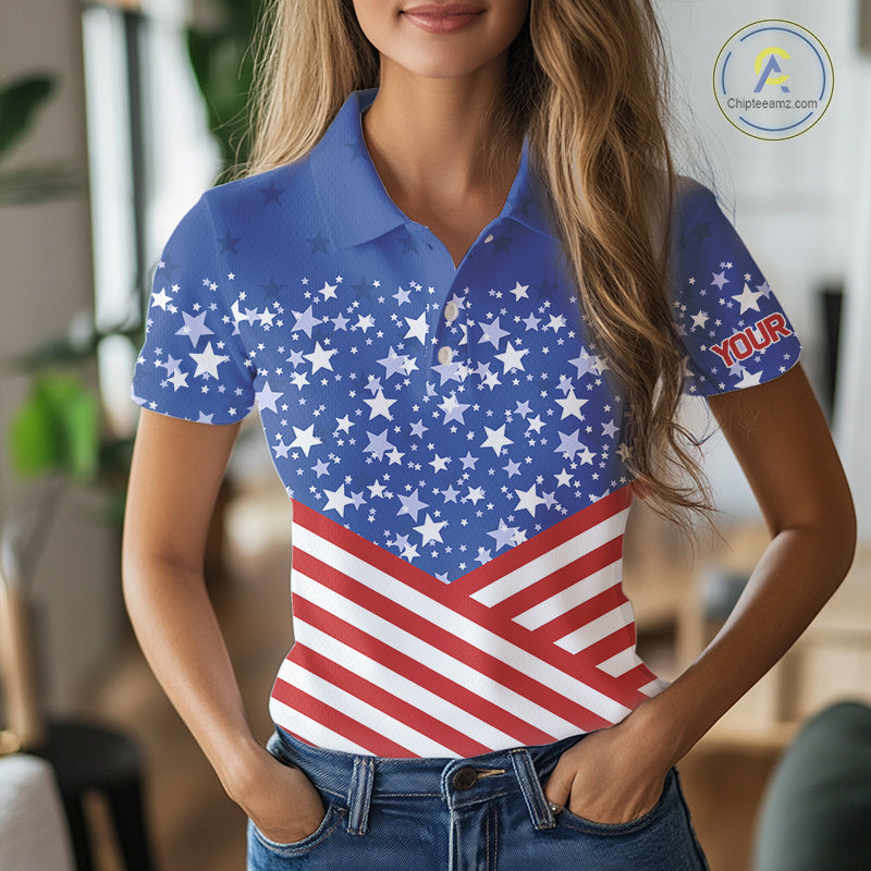 Red, White and Blue Women golf polo shirts Custom American Flag patriotic Golf attire for ladies NQS10137