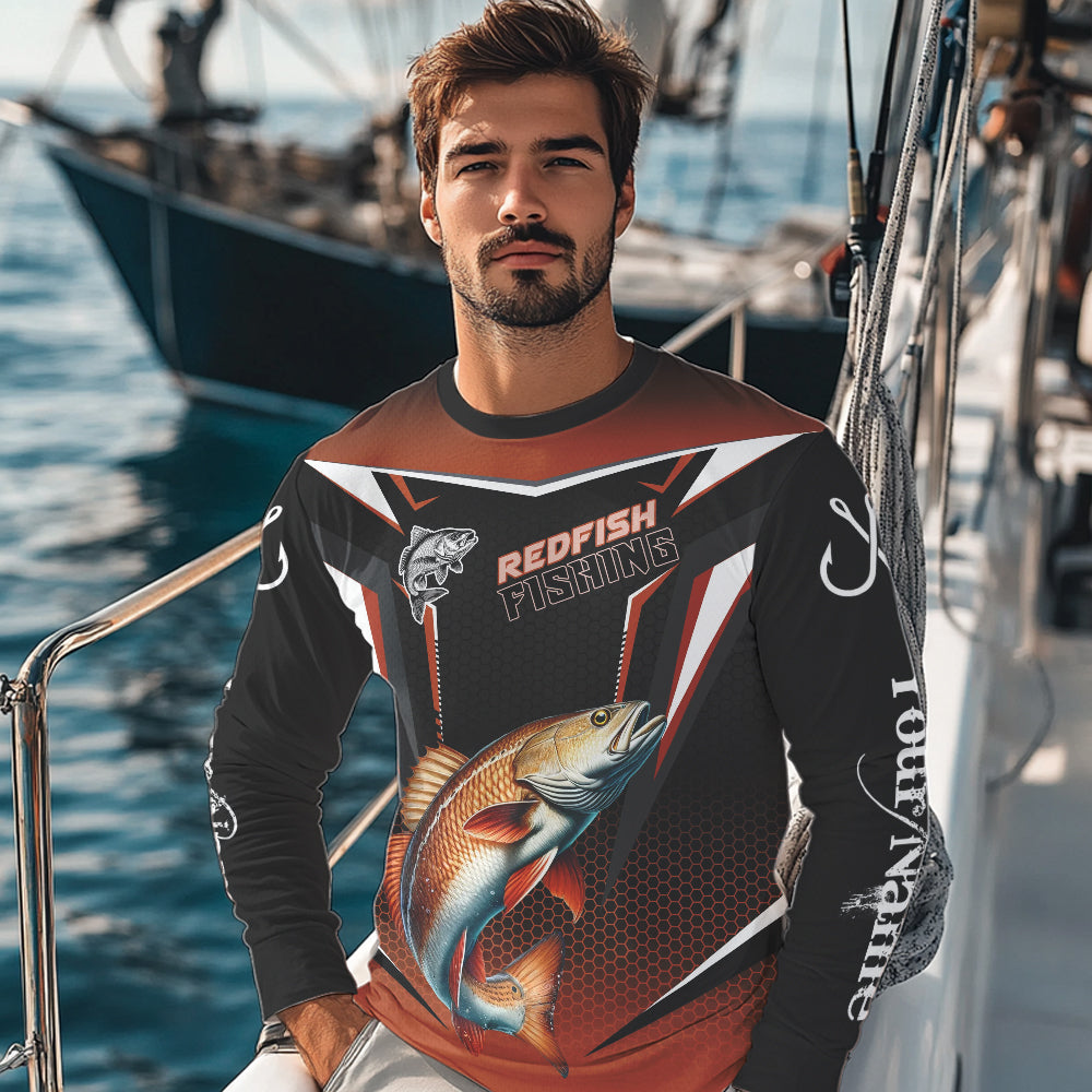 Black and Orange Redfish Long Sleeve Fishing Shirt, Personalized Red Drum Fishing Tounament Jersey NQS9774