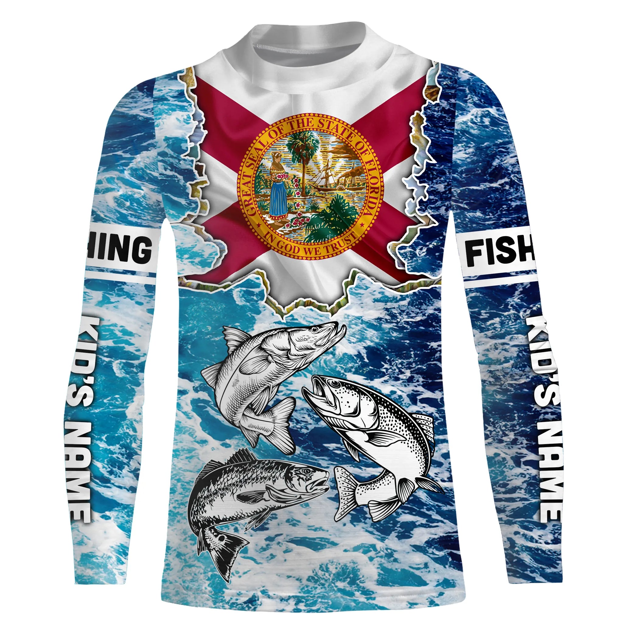 Florida Flag Redfish, trout, snook blue wave camo custom performance long sleeve fishing shirts NQS4771