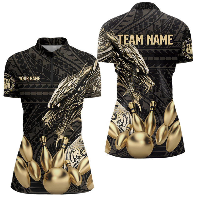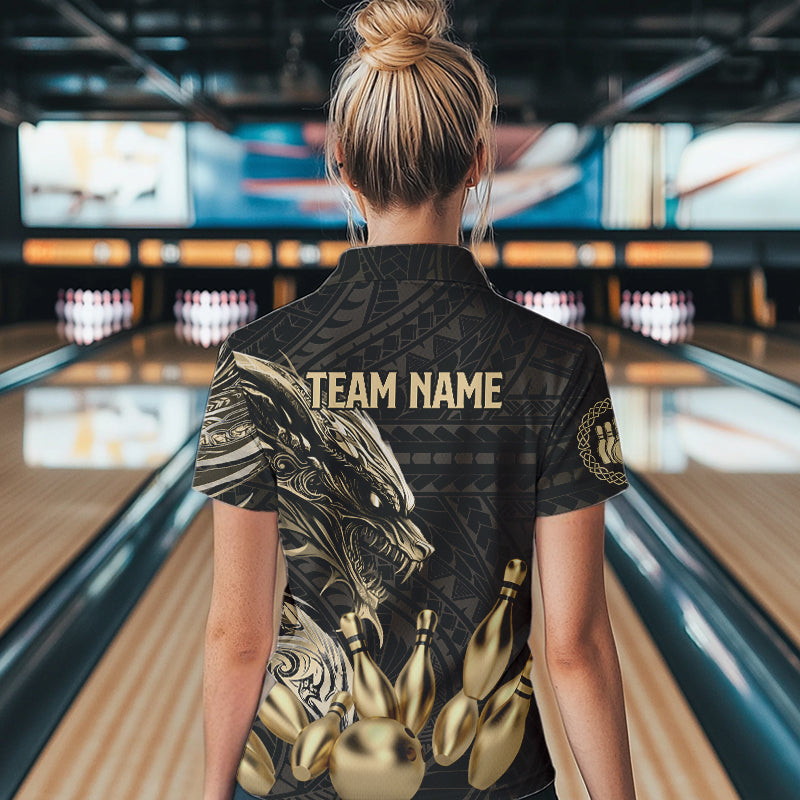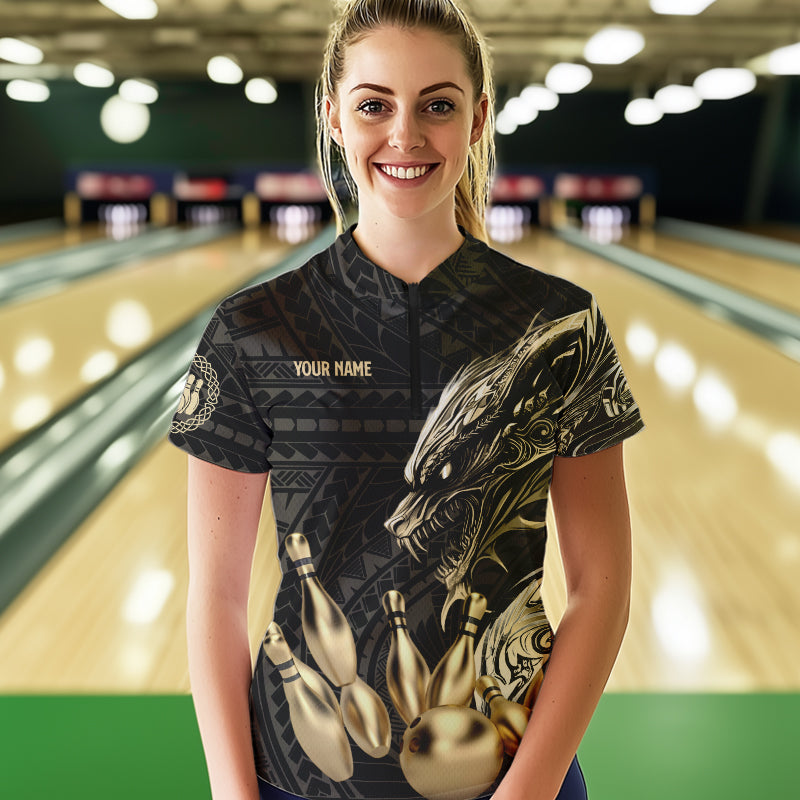 Black and Gold Dragon Tribal Bowling Polo, 1/4 Zip Shirts For Women Custom Retro Bowling Team Jerseys NQS9591