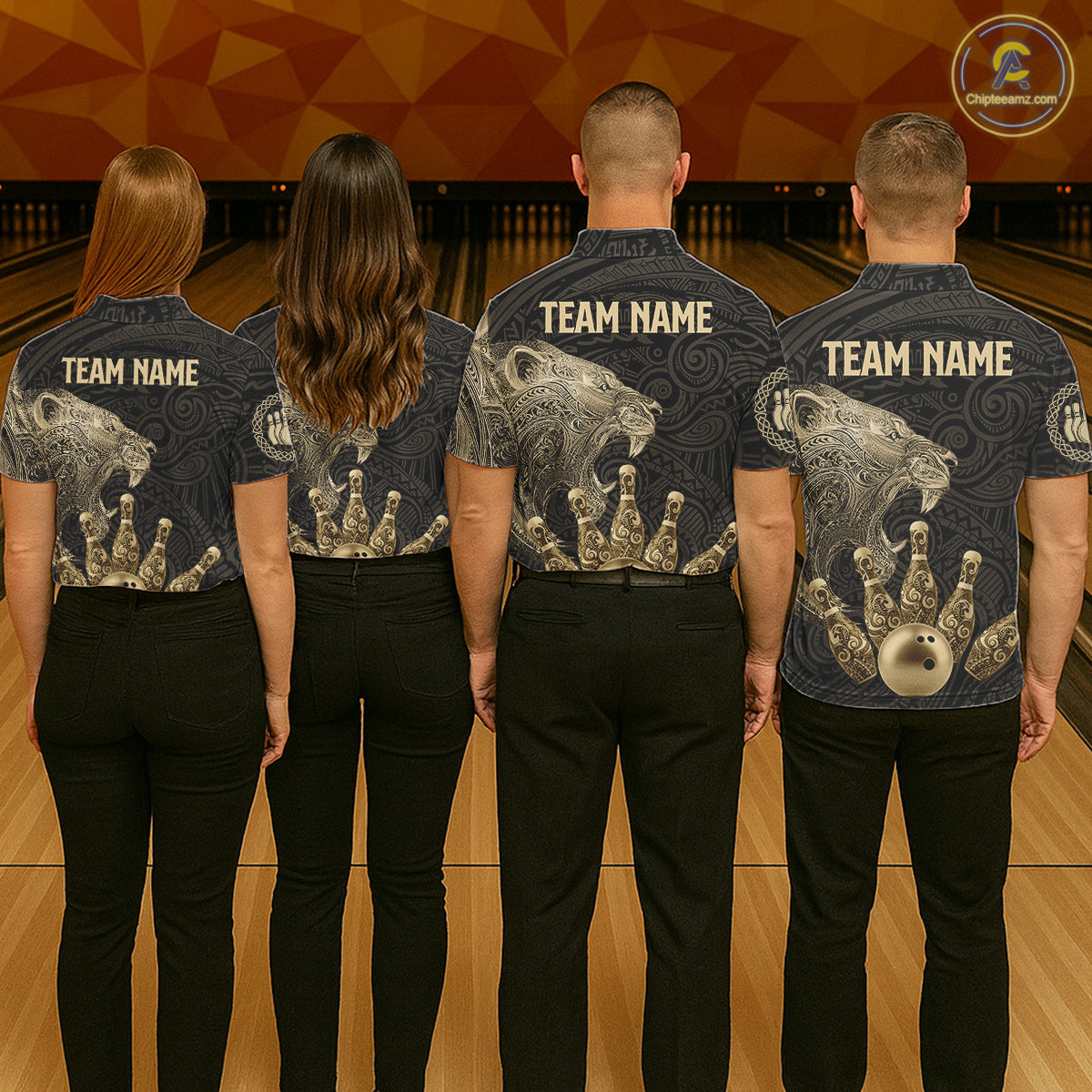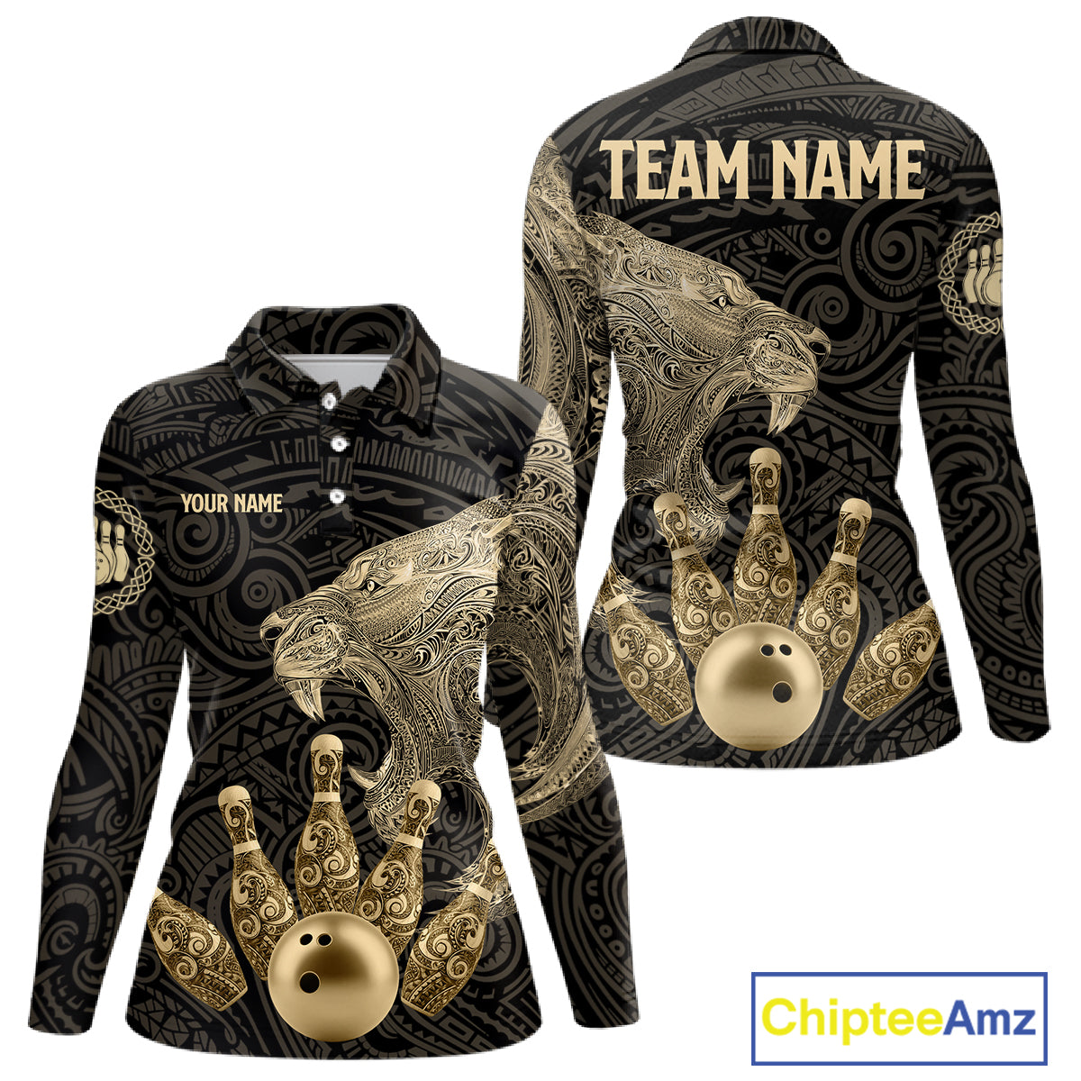 Black and Gold Lion Tribal Bowling Polo, 1/4 Zip Shirts For Women Custom Retro Bowling Team Jerseys NQS11149
