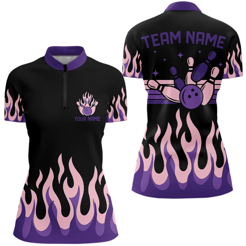 Black and Purple Flame Retro Bowling Polo, Quarter Zip Shirt for Women Custom Bowling Team Jerseys NQS9427