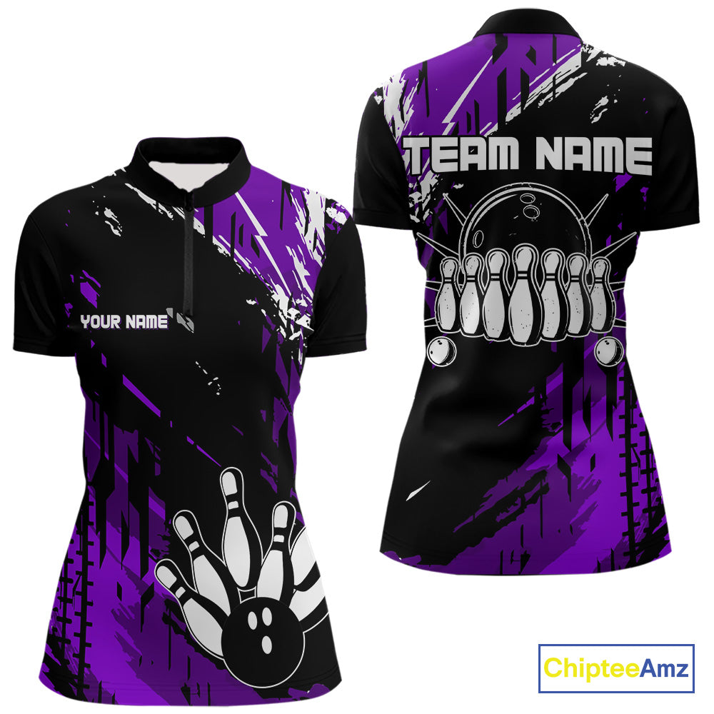Black and Purple Women bowling shirts Custom retro bowling ball and pins bowling team league jerseys NQS10642