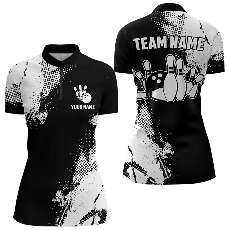 Black and White Retro Women Bowling Polo, Quarter Zip shirts Custom team bowling jerseys ladies outfit NQS9274