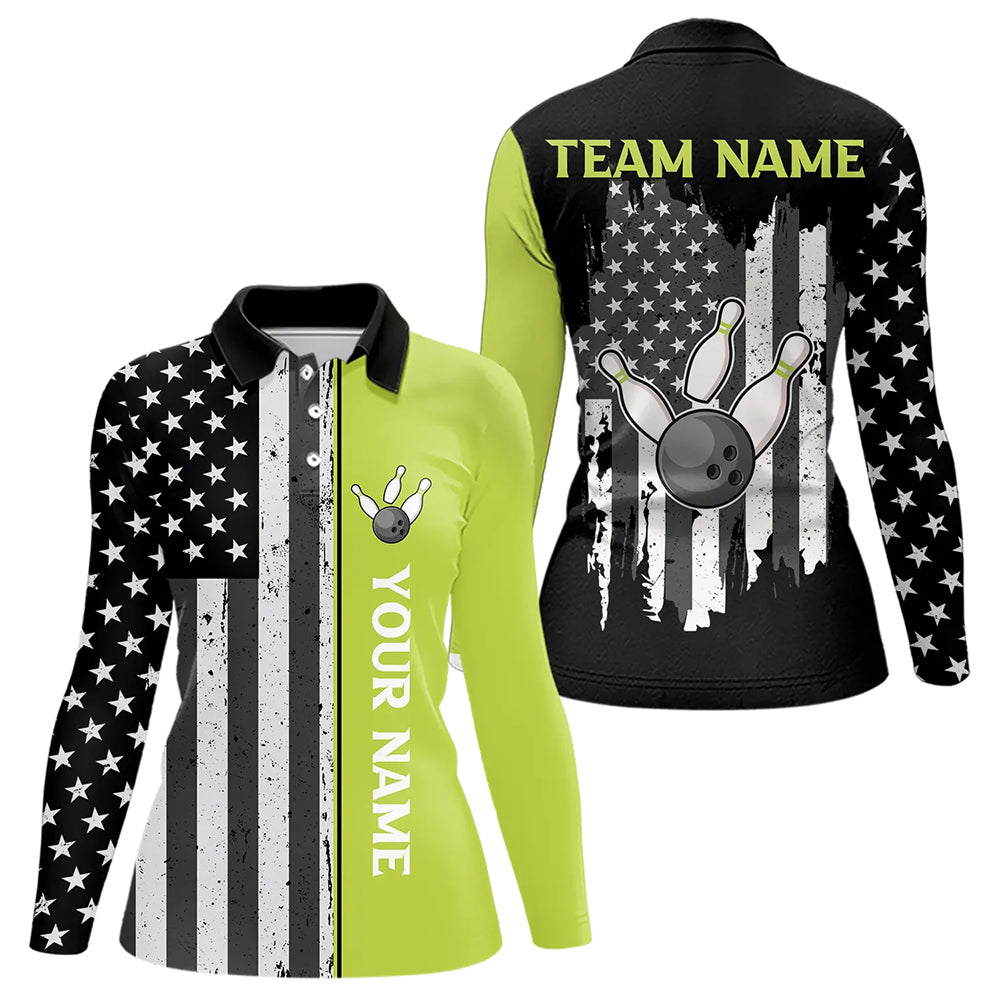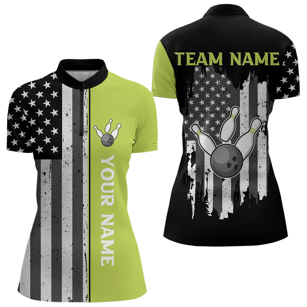 Black White Retro American Flag Bowling Shirts For Women Custom Patriotic Bowling Team Jersey | Green NQS9638