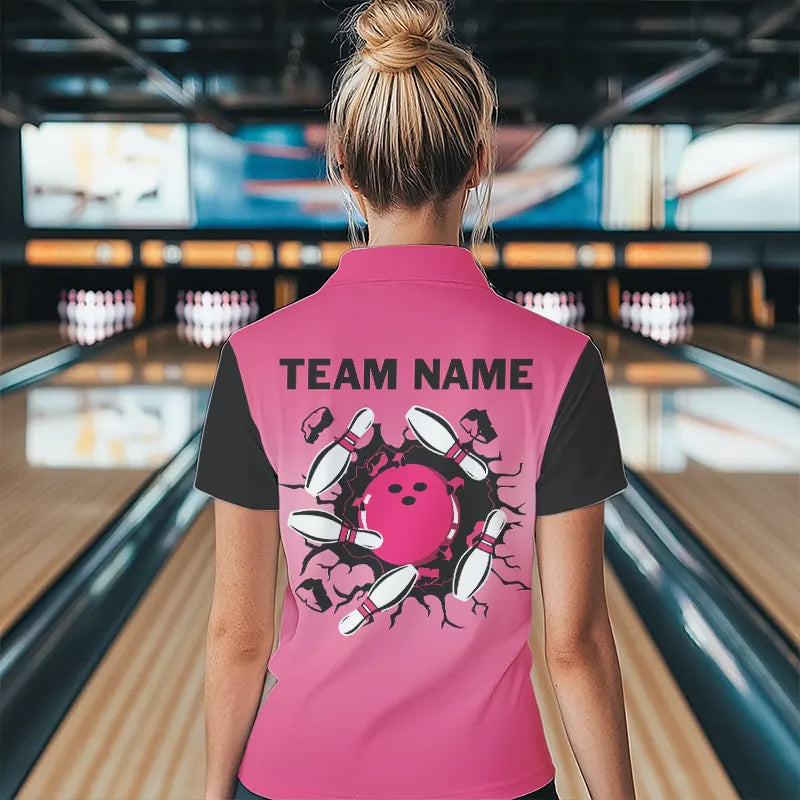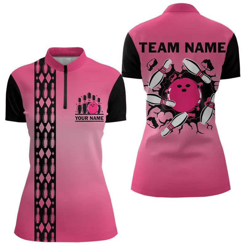 Personalized Black and Pink Retro Bowling Polo, Quarter Zip Team Shirts For Women Custom Bowling Gifts NQS9422